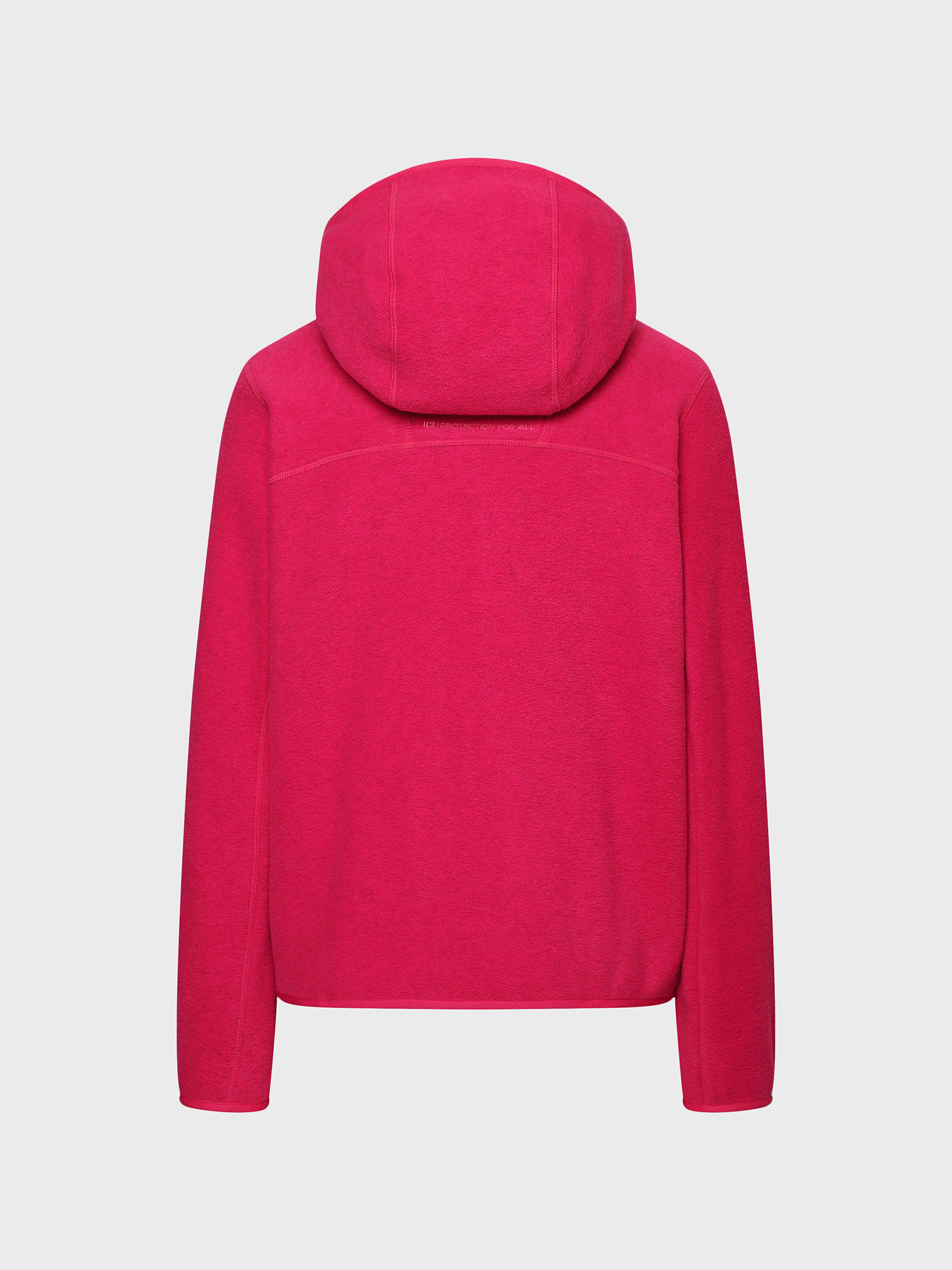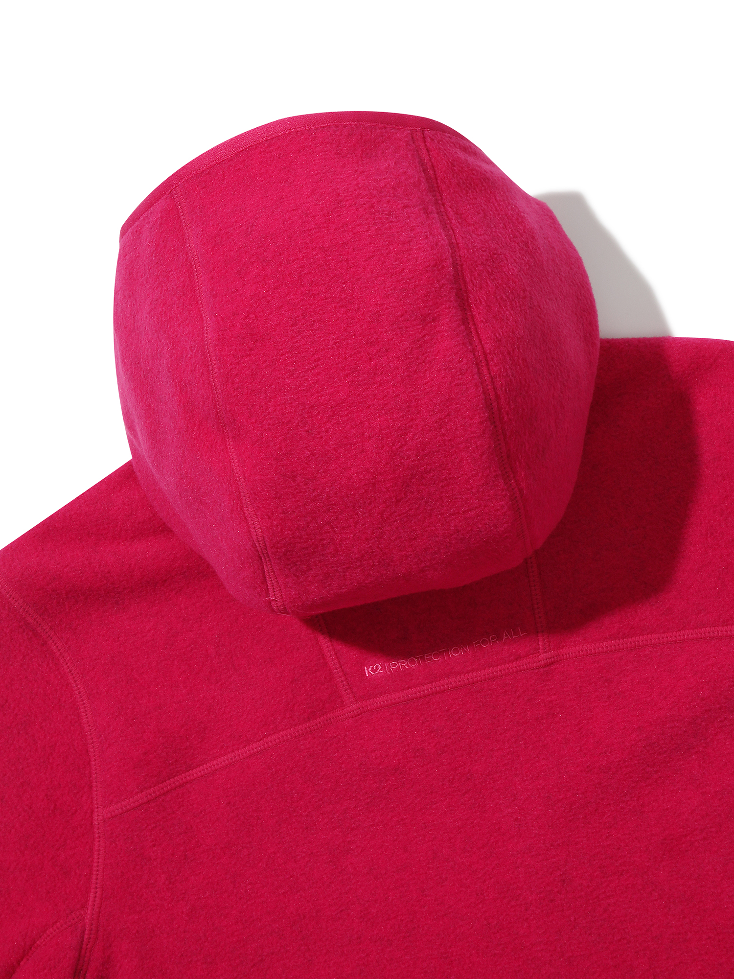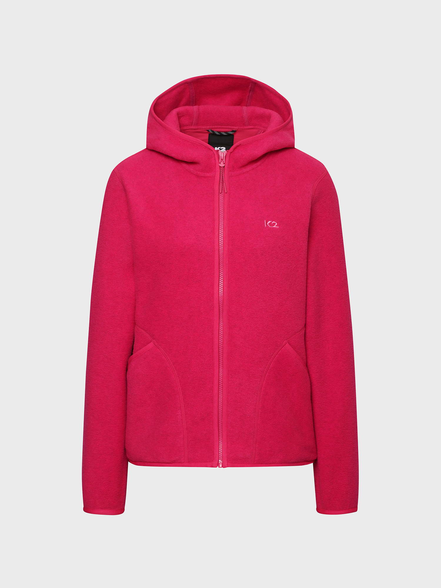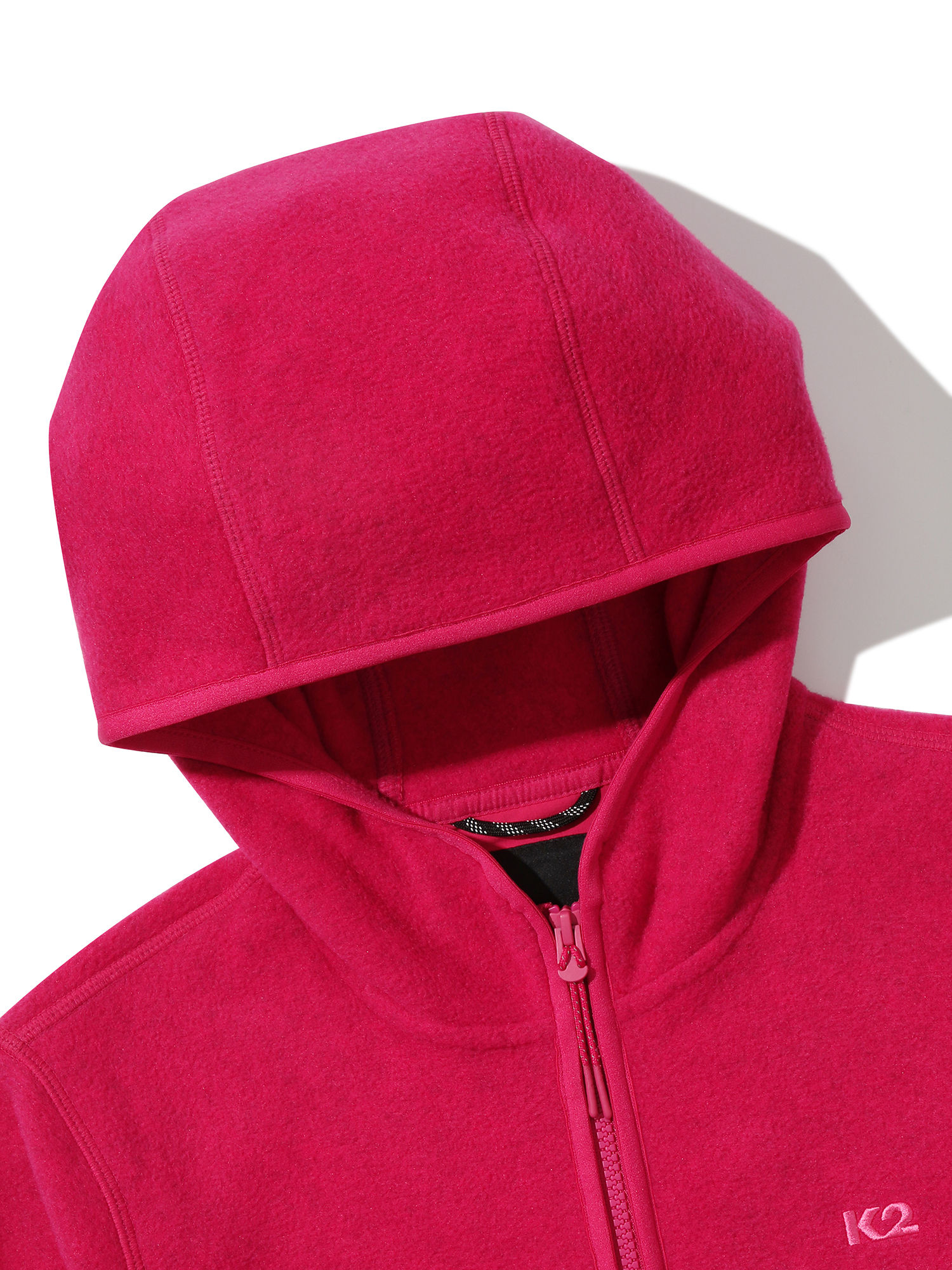 멜란지 마이크로 플리스 소재를 적용하여 가볍고 보온성이 우수하며 곡선을 활용한 여성스러운 디자인이 특징이 후드 일체형 플리스 자켓